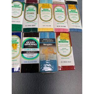 Mixed lot of vintage seam binding in various colors and brands. Ideal for sewing, crafting, and DIY projects.