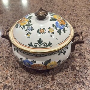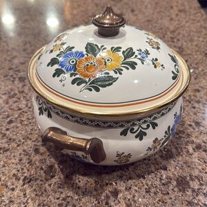 Vintage Asta Enamelware Floral Dutch Oven with Brass Handles. This decorative and functional pot features a beautiful floral pattern on a cream background, accented with elegant wooden handles. Ideal for stove-top cooking or as a charming centerpiece. Excellent pre-owned condition, shows minimal signs of wear consistent with age. This piece is a classic example of Asta's quality craftsmanship and is a wonderful addition to any kitchen or collection.