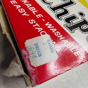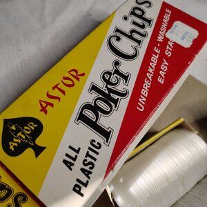 Step up your game night with this vintage lot of Astor plastic poker chips, complete with their original retro packaging! These chips come in the traditional red, white, and blue color set and are made of sturdy plastic designed to be unbreakable and washable, as advertised.