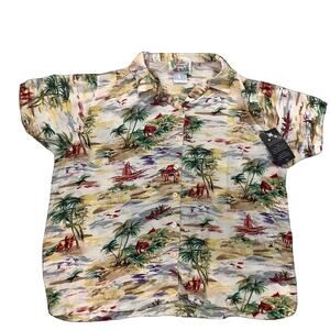 A vintage button down by At Last Tropiqwear with Hawaiian print all over the shirt in great condition