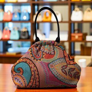 This beautiful vintage Atenti handbag captures the brand’s signature blend of artful design and timeless craftsmanship. Made from richly textured tapestry fabric featuring a stunning paisley and floral motif in jewel tones, this bag is both eye-catching and elegant.