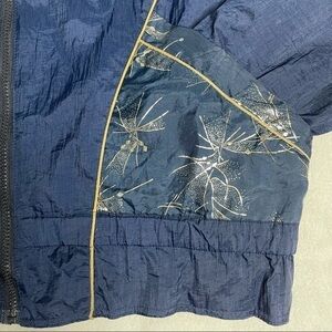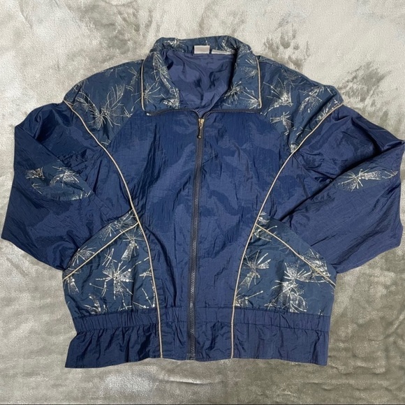 Keywords: Vintage Athletic Works windbreaker, 90s jacket medium, navy silver track jacket, retro streetwear, full zip nylon jacket, throwback athletic wear, silver foil print jacket, blue windbreaker men women