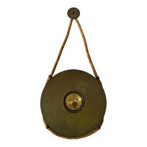 This vintage Atlanta wall clock features a 7-jewel, 8-day wind-up movement made in Western Germany by F. Mauthe, a respected German clockmaker. The clock has a striking nautical-inspired design with a rope-wrapped case and hanger, brass accents, and a glass-covered dial. Roman numerals and gold-tone hands complete the classic mid-century look.