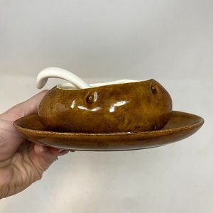 Vintage Atlantic Mold small potato dish with spoon. Base is attached to dish. Likely a sour cream or gravy dish. Signed Millis.