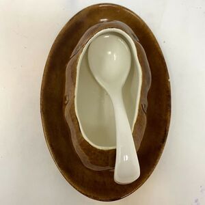 Vintage Atlantic Mold small potato dish with spoon. Base is attached to dish. Likely a sour cream or gravy dish. Signed Millis.