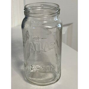This is an authentic vintage Atlas Mason jar, embossed with the classic Atlas Mason lettering. Dating from the mid-1900s, this clear glass jar is perfect for collectors, rustic kitchen décor, or creative repurposing.