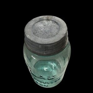 Vintage Atlas Strong Shoulder Mason Blue Glass Quart Jar zinc lid FLAW Bubble