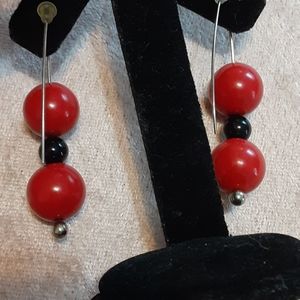 Very cute Modernist earrings. Red and black beads. Some slight tarnishing on the silver tone hooks from where the rubber backs had been left on. Overall really phenomenal earrings!