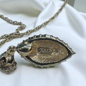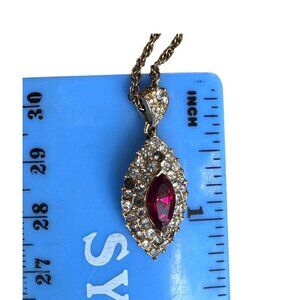 Elegant vintage pendant necklace by Attwood & Sawyer featuring a stunning gold tone with ruby and white rhinestones. Perfect for adding a touch of glamour to any outfit.