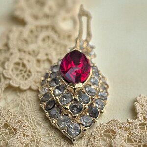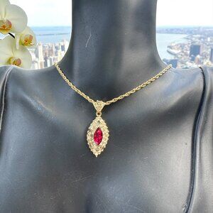 Elegant vintage pendant necklace by Attwood & Sawyer featuring a stunning gold tone with ruby and white rhinestones. Perfect for adding a touch of glamour to any outfit.