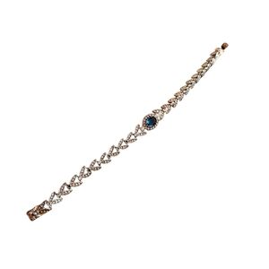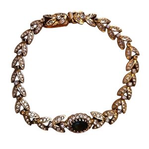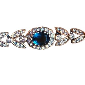 This stunning vintage bracelet features a gold design adorned with sparkling rhinestones and a striking sapphire centerpiece.