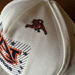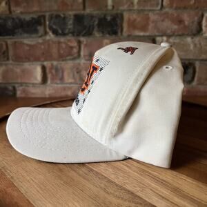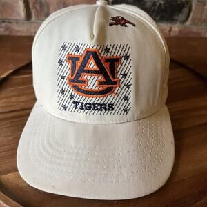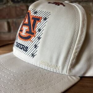 Show off your love for the Auburn Tigers with this vintage white snapback hat from Roman Pro. Made in the USA in the 80's or 90's, this unisex adult hat is perfect for any fan of the football team. The hat features the team's logo and colors, making it a great addition to any fan's collection. It's officially licensed and perfect for regular season games. One size fits all, so don't miss out on this unique piece of fan apparel.