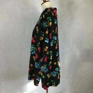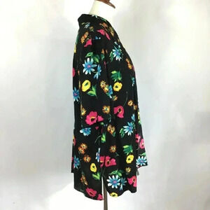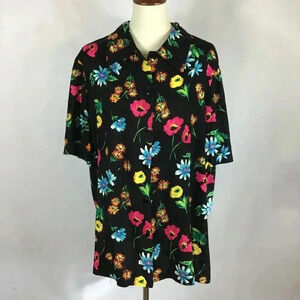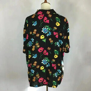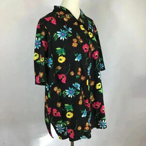 Brilliantly hued vintage black floral tropical shirt by August Max Woman in plus size 20. Features single lapel, button front, short sleeves and side slits for ease of movement. Vintage (pre-owned) garment.