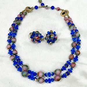 Vintage Aurora Borealis Blue Crystal Bead Necklace Earrings Set Retro Jewelry