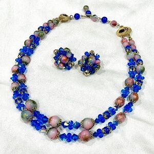 Absolutely spectacular vintage necklace/earrings jewelry suite from the 1950’s. Featuring a rich cobalt blue color aurora borealis faceted crystal beads with brass stations and metallic painted beads to complete this eye catching demi parure. Like New Condition - looks like they were never worn. Truly a statement piece that matches well with jeans or your favorite dress. Beautiful fall colors perfect for all your upcoming holiday festivities!