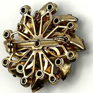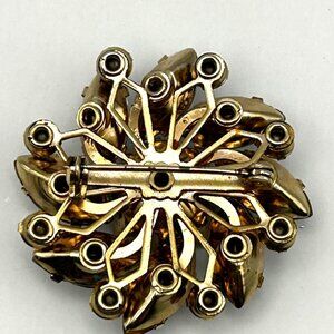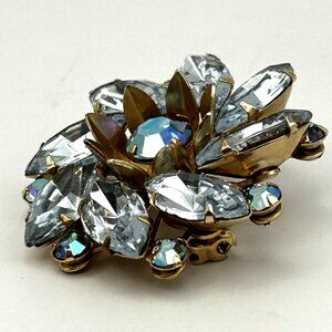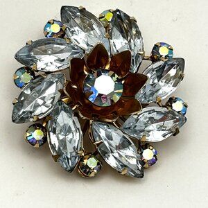 Vintage rhinestone brooch in a layered floral design. Features sparkling marquis and round cut AB coated rhinestones, set in gold tone metal base. The brooch measures approximately 1 1/2 inches across and has a secure rollover clasp. Mid-century 1950s-1960s costume jewelry. Clear rhinestones with rainbow AB shimmer.
