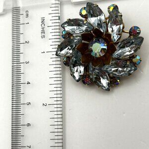 Vintage Aurora Borealis Blue Rhinestone Floral Brooch Layered Riveted 1950-1960s