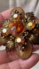Stunning vintage brooch with a central amber stone. Surrounded by iridescent aurora borealis crystals. Bronze leaf details add elegance.