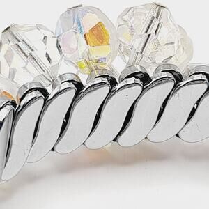 Each faceted bead catches the light with rainbow flashes, and the bracelet is built on a strong vintage stretch base in silvertone. A classic mid-century cha-cha style — perfect for formal wear, bridal jewelry, holiday parties, or any outfit that needs extra shimmer!