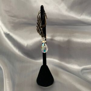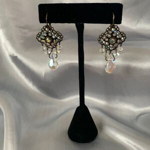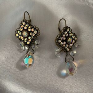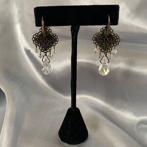 These stunning vintage-inspired earrings feature a square filigree design adorned with shimmering aurora borealis rhinestones. Dangling from the ornate bronze-tone setting are faceted crystal drops that catch the light beautifully, creating an iridescent rainbow effect with every movement. The lever-back closure provides secure and comfortable wear. Measuring approximately 2” long, these statement earrings bring a touch of old-world glamour and timeless sparkle to any outfit. Perfect for special occasions, weddings, or collectors of vintage-style jewelry.