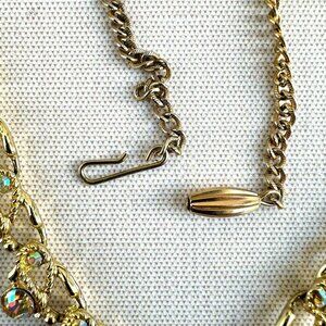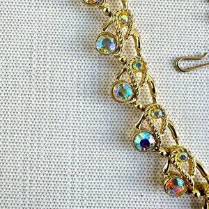 This vintage 1950s gold-tone choker necklace features dazzling aurora borealis rhinestones set in a linked openwork design. The stones catch the light beautifully, shifting between pink, blue, and gold tones depending on the angle. It is a classic piece of mid-century costume jewelry with elegant sparkle and timeless charm.