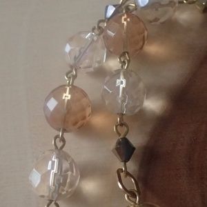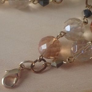 * Bronze, peach, and clear, colored beads on a brass metal chain with clasp enclosure.