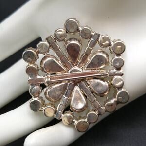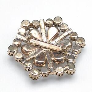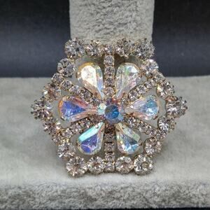 *Description: Gorgeous aurora borealis vintage brooch from the 1950s to 1960s with clear rhinestones around the outside design and auorora borealis rhinestone in the center flower design. The back had a gold wash which is slightly worn off. All rhinestones are prong set and full of sparkle and shine. This would be beautiful for a wedding or any formal event. This would be a great addition to your jewelry collection or make a great gift!