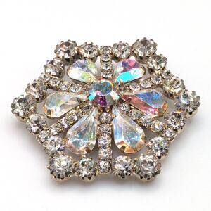 Vintage Aurora Borealis Rhinestone Brooch, Wedding Pin, Mid-Century, 1 7/8 Inch