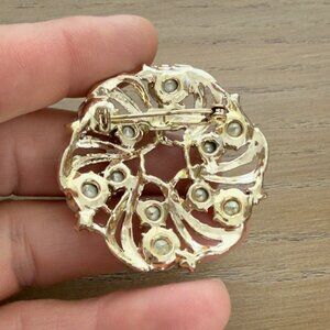 This vintage brooch exudes mid-century elegance with its shimmering aurora borealis rhinestones set in gold-tone metal. A timeless piece for collectors or to accentuate classic ensembles.