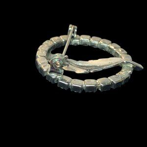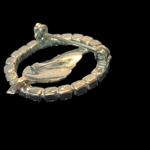 This vintage brooch features a silver-tone feather set within a circle of shimmering aurora borealis rhinestones. A timeless accessory for a touch of classic elegance.