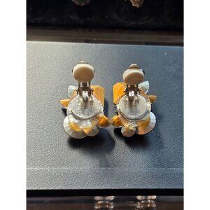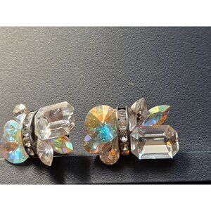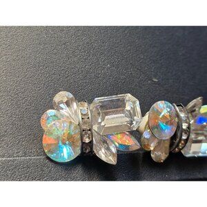 These vintage clip-on earrings feature stunning aurora borealis rhinestones arranged in an elegant design. Their vintage charm is highlighted by a reflective, colorful finish, providing a sophisticated touch to any ensemble. Ideal for collectors of vintage jewelry, they offer timeless elegance and a distinctive sparkle.