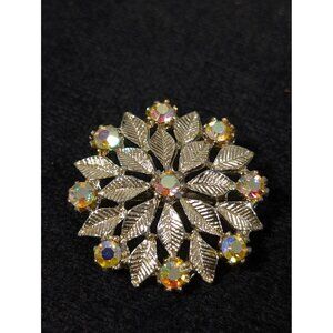 Vintage Aurora Borealis Rhinestone Flower Brooch Gold Tone Round Leaf