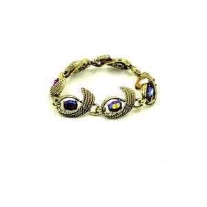 Vintage aurora borealis rhinestone link bracelet in gold tone. Signed.