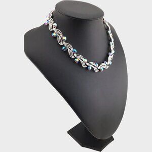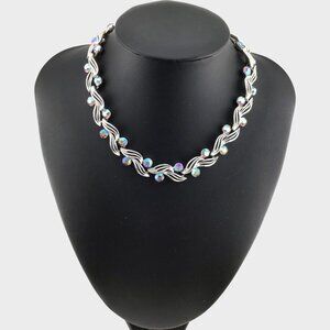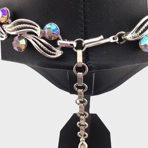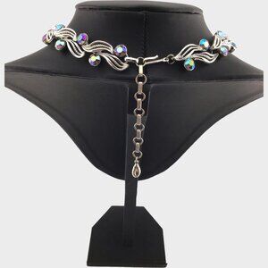 Beautiful silver-tone choker necklace with aurora rhinestones. This vintage necklace is about 15" long with a 3" extender, allowing to wear as an 18" necklace.