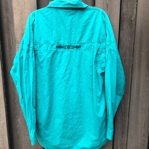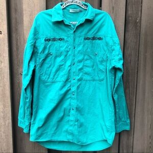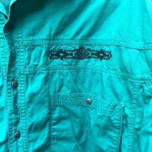 Stylish teal button down shirt. Features embroidered details. Perfect for casual wear.