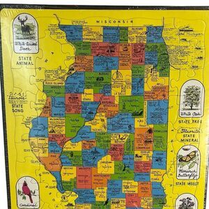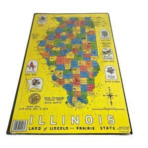 This vintage puzzle map of Illinois, made by Austin-Peirce in 1986, is a delightful addition to any puzzle enthusiast's collection. With 100-249 pieces, it offers a challenging yet fun experience for ages 4 and up, and is perfect for boys and girls alike. The colorful multi-piece puzzle features a map theme and is made of sturdy cardboard material. It is in good shape and ready to be pieced together for hours of entertainment. This puzzle is a great way to explore Illinois and its geography, and it was made in the United States with no modifications.