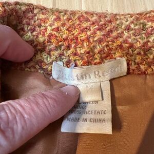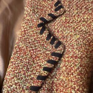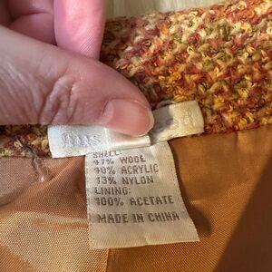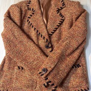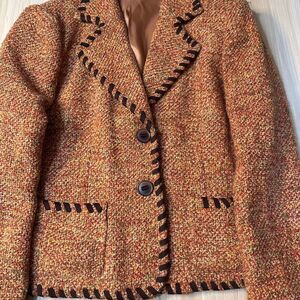 Stunning vintage Austin Reed tweed blazer in warm autumnal tones of rust, mustard, and olive. Features intricate whipstitch leather trim along the lapels, pockets, and hems—giving it a unique Western-meets-academia feel. This structured, tailored fit is perfect for layering over turtlenecks, dresses, or button-ups for that chic, timeless look.