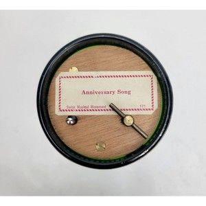 The music box plays the tune "Anniversary Song". There is a brass wind up knob on the bottom . There is an automatic push stopper that releases to allow the music to play when the glass is lifted up and stops the music when the glass is set down.