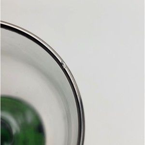Set on a green glass stem that flows into a large green ribbed base that holds the Swiss-made music box