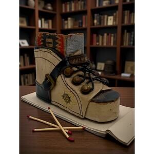 This charming vintage souvenir match holder, crafted in Austria circa 1930s, is designed in the form of a mountain hiking boot. Made of painted wood with leather details, it features a buckle strap, laced front, and a hand-painted Edelweiss flower — a classic alpine symbol.