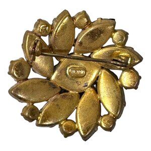 A luxurious vintage brooch that transforms any ensemble from ordinary to extraordinary, combining rich emerald-toned glass stones with delicate golden metalwork for a touch of mid-century glamour. Perfect for elevating classic and contemporary looks with its intricate leaf-like design and luminous central stone.