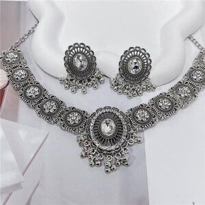 Enhance your style with this captivating **Antique Silver-Tone Jewelry Set**, a beautiful blend of vintage charm and modern craftsmanship. This intricately designed set includes a statement necklace and matching earrings, perfect for festive occasions, weddings, and cultural celebrations.