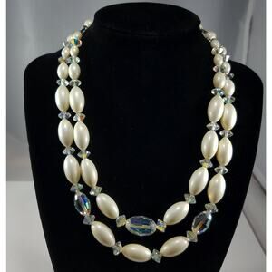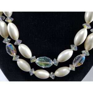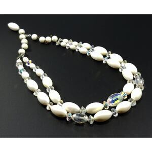 This is a beautiful mid-century double strand beaded necklace featuring Austrian crystal and Lucite beads from the 1950s–1960s. The faceted crystals include oval and bicone beads with a dazzling Aurora Borealis (AB) finish, adding a subtle rainbow glow. They are paired with creamy white Lucite oval beads, giving the necklace a timeless and elegant look.