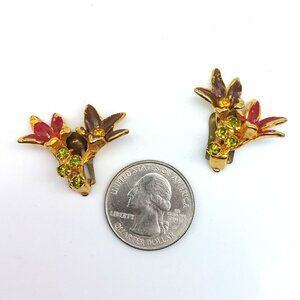 A charming pair of vintage clip-on earrings featuring a delicate lily flower design. Adorned with vibrant rhinestones in red, yellow, and green tones, these earrings capture the elegance of a bygone era. The gold-tone metal adds a touch of sophistication, making them an exquisite accessory for those who appreciate timeless beauty.