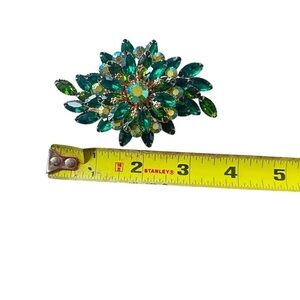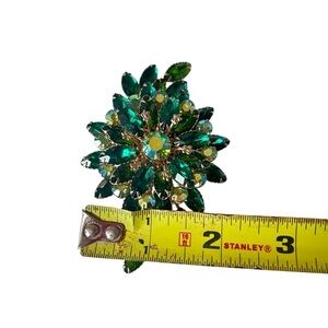 Stunning vintage Austrian crystal brooch with emerald green stones. Gold accents enhance its elegance. Extremely well made in prongs to filigree back. Light shines through crystals to make them sparkle. Dimensional. Unmarked. A floral leaf design. 3 different green crystals are used- emerald, olivine, & Aurora mint. Looks amazing in lapel, hat, scarf, or blouse collar. One of a kind. Rare. Premium quality. Euc