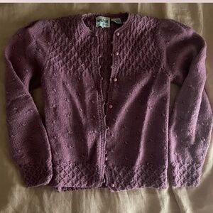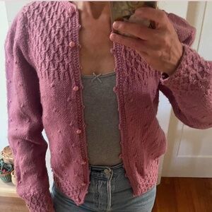 Gorgeous vintage Austrian-style cardigan. Pretty blush color.. made by Nordstrom from the 80s. 100% wool.. pretty popcorn knit details and pink pearl-like buttons and puff sleeves. Fits small, extra small.