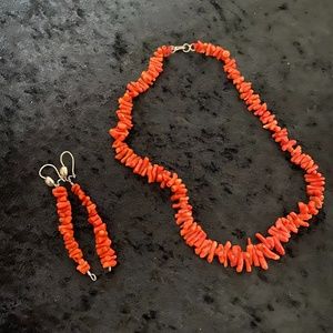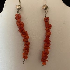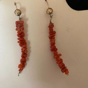 Simple strands of authentic red coral hanging from sterling silver earring wires. These pretty earrings look great with a necklace, shown here and posted separately. I'll offer a discount if they're purchased together. Earrings are about 3" long.