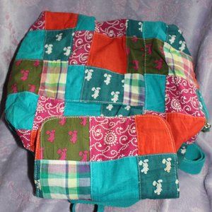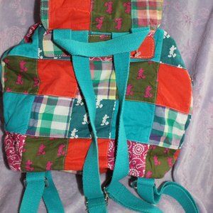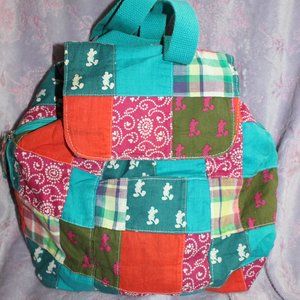 Vintage Authentic Disney Parks Cloth Patchwork Backpack. The colors are varied and pretty. Photo shows colors. The patchwork is top stitched. The fabric has different illustrations/pictures of Mickey Mouse as well as a bandana style print,, plaid , etc. Straps are teal in color. Interior is lined, Same color as straps. Zipper compartment inside Approx Size: 12" x 12" This could be a kids backpack, teen or adult. Condition: This is in overall very very nice condition. Not torn or worn. There is one small spot which you can see in the 2nd photo in the listing. Not blaring out. Used once for a few hours. Stored in non smoking home.
