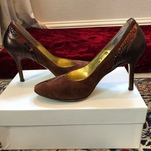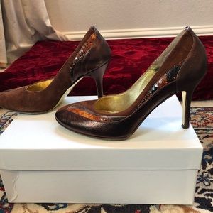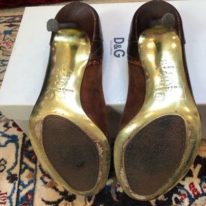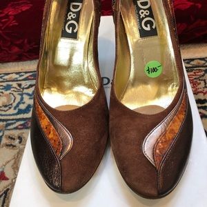 In amazingly good condition authentic D&G brown and bronze pumps. Leather and suede combo with 4” heel. Barely scuffed at the bottom shown in pictures. Comes with original box and dust bag. Added comfort pads easily removable. Let me know if you have any more questions, concerns, or need more information/ pictures. Open to offers!