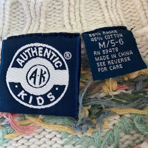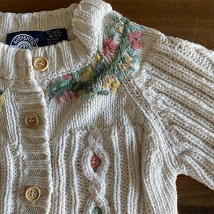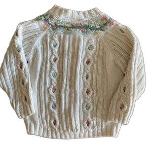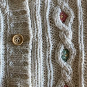Authentic Kids cardigan, girls' medium 5/6, 55% ramie/45% cotton. Button closure, wooden buttons, off-white cable knit, pastel floral embroidery around neck/down front & back/arms. A few snags. The most gorgeous, heavyweight cable knit cardigan perfectly layered over a spring or fall dress. Flat measurements: Pit to pit-14” Sleeve length-10.5” Length-17”